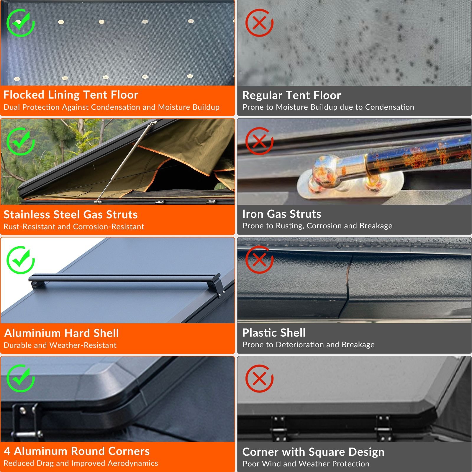 3. [Hardshell Rooftop Tent with Top Configuration 3 Layer Luxurious Mattress] - The suv car rooftop tent is designed with thick wear-resistant polyester, honeycomb aluminum hardshell with aluminium round corner, stainless steel gas struts, 3-layer built-in mattress, flocked lining tent floor, 13 interior ceiling&sidewall storage pouches, zipper netting windows and upper small mesh window, providing structural strength&rigidity, UV-resistant, waterproof, breathable and resistant to moisture.