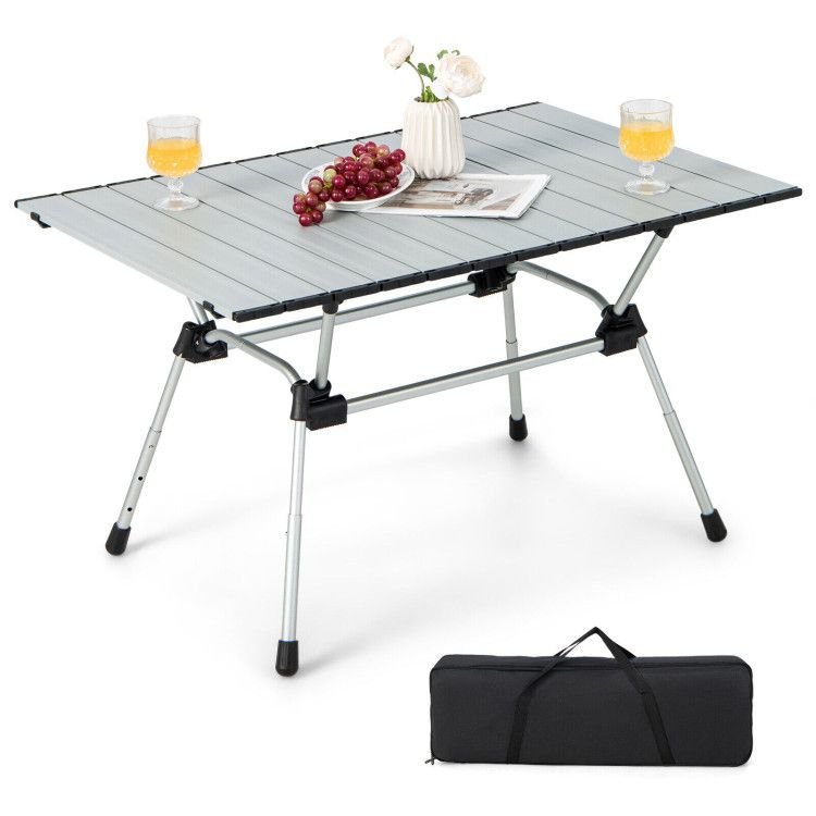 ● Easy and Quick Installation in 3 Minutes: The aluminum camping table with a roll-up tabletop can be easily set up, and all you need to do is take out all parts, extend out the frame and install supporting legs, install 2 side bars, and unroll the tabletop, then adjust the height to the desired position. There are no tools required.