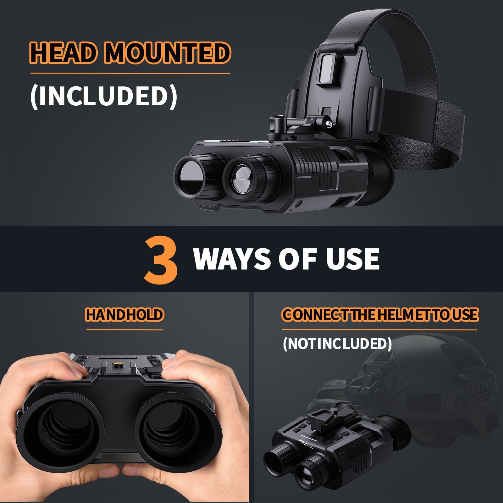 The Helmet Night Vision Binoculars feature a No-Glow INFRARED ILLUMINATOR. High-definition images with 2048x1536 pixels; 1920x1080@ 30FPS video. The body's unique non-slip and 6-button design is easy to use.Thanks to our powerful 850 NM infrared illuminator; you can hunt; monitor wildlife; explore the wilderness or protect your farm during a pitch-dark night – NO external light needed!