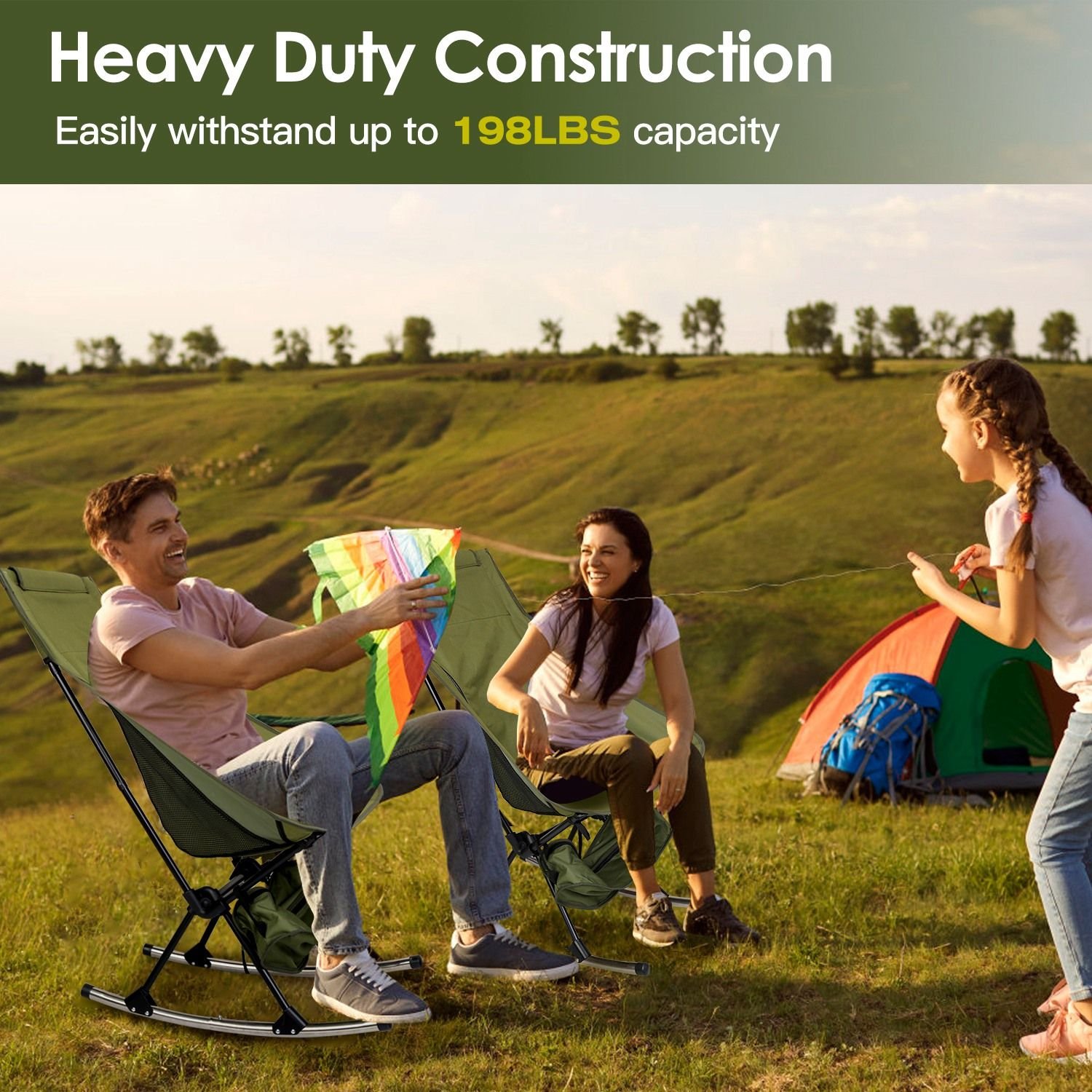 *Easy to Setup*:You can install this foldable camping chair in 5minutes without tools needed. First,set up the supporting frame and hang on the storage bag,then insert the tube into the slot of chair cloth. Finally,insert the frame into the curved rocking legs and connect the rocking legs. Make sure every part of this rocking chair is tightly fixed.